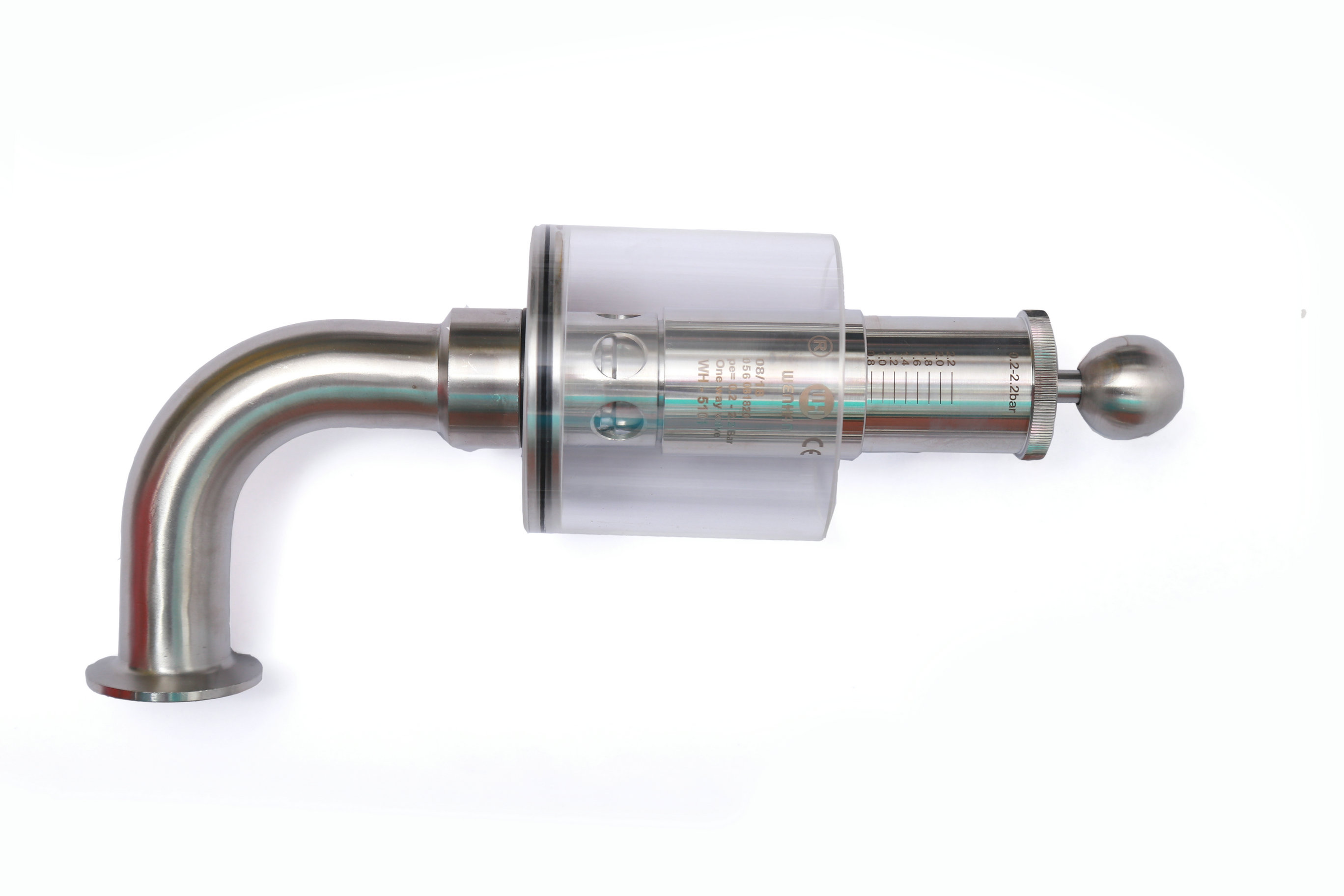 Wh-5101E 鏈接;快裝,卡箍。管徑;彎頭Φ32*1.5 . 內部設計壓力;由彈簧控制. 工作介質;氣體。手動式,旋鈕調節刻度壓力。